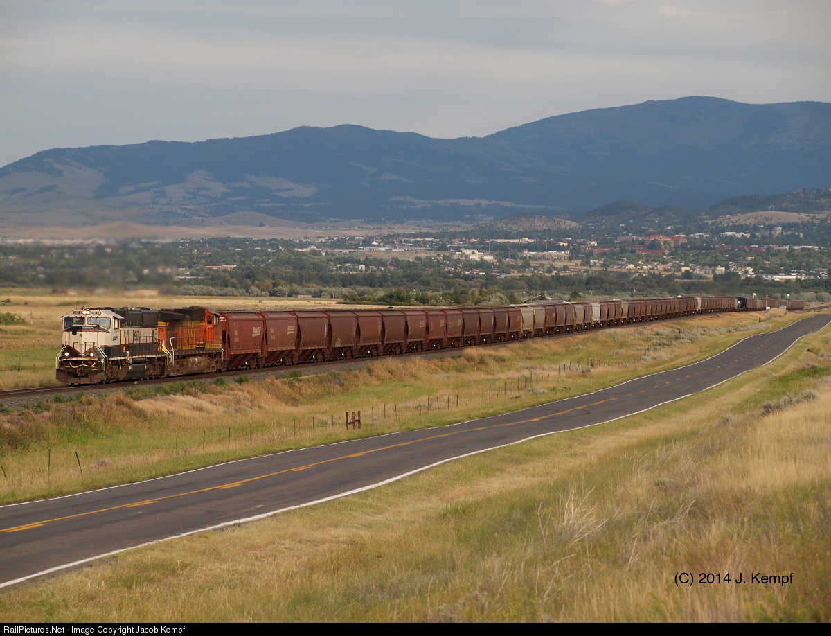 | An entire grain train is visible in this one shot. Leading is a former BN executive SD70MAC, followed by a ubiquitous GE Dash-9. Four MRL SD70ACes can be seen in distance helping the train up the grade. |