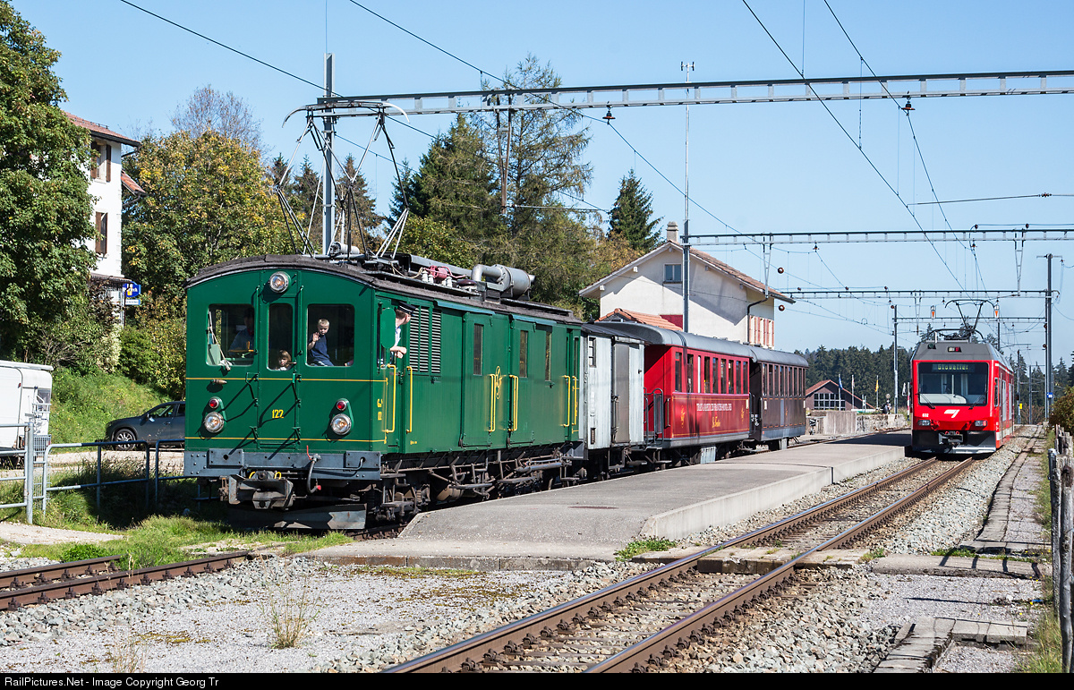 Dual power locomotive Gem 4/4 # 122 of "La Traction", built in 1916 as electric baggage railcar for the Elektrische Solothurn-Bern Bahn (ESB) by SWS and MFO, fitted with an aditional diesel motor and generator in 1973, running for "La Traction" since 1996. This vehicle is very seldom seen with a passenger train.
