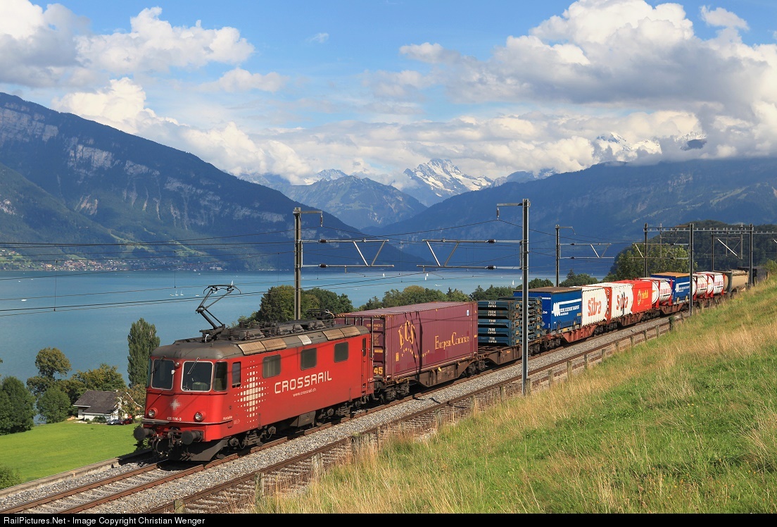 | 436 114 pushes a Crossrail Train, hauled by two Class 186, up the Lötschberg Line along the Lake Thun. |