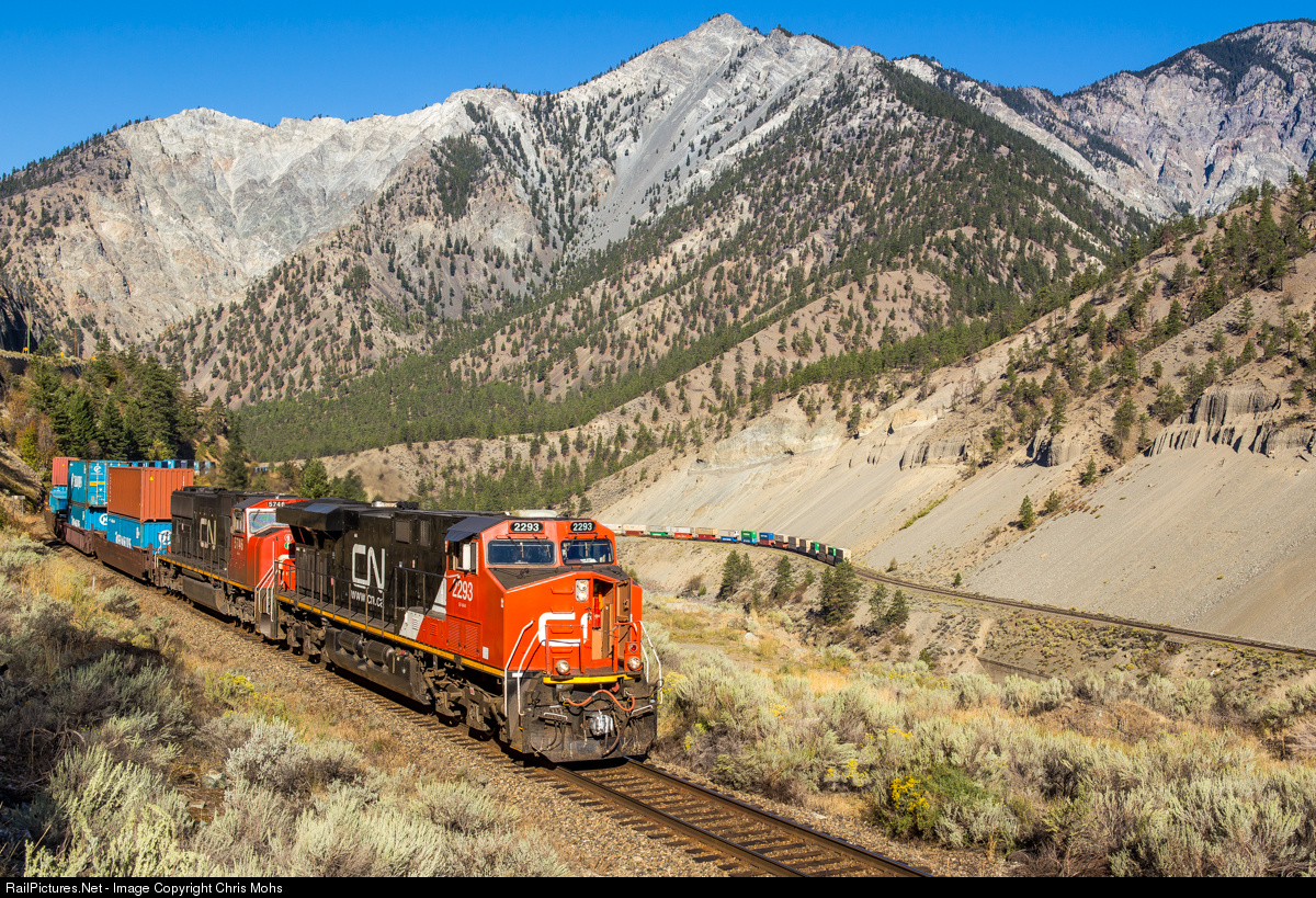 | Eastbound stacks, with Canadian National 2293 head uphill, as Westbound Canadian National stacks head downhill to Vancouver. |