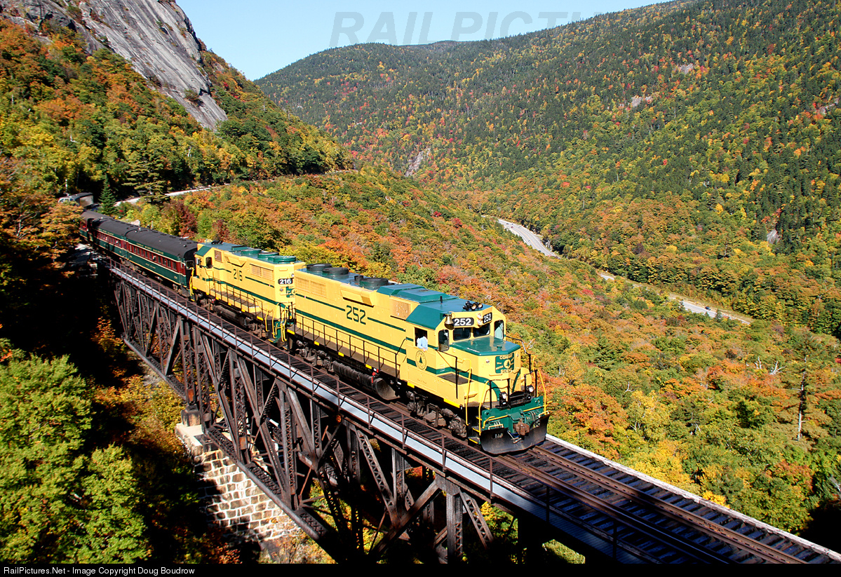| Shooting the Notch Train crossing Willey Brook Bridge has been a goal of mine for as long as I have been shooting trains. An attempt at this photo two years ago ended in being caught in a rain shower on the mountain that ruined the shot. Since I was in the area viewing foliage this weekend I decided it was time to take the hike and try again. Everything lined up perfectly. CSRR happened to be using both "Yellow Birds' as the consist was a full seven cars. The foliage was at its peak and the lighting was just right. |