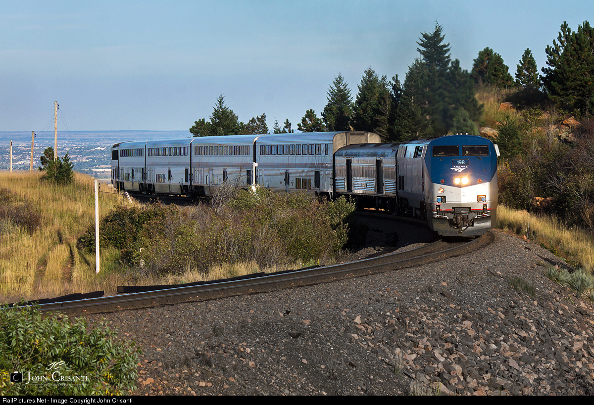 | An eight and half hour late Amtrak #5, the California Zephyr, led by Amtrak no. 198 round the s-curve at Blue Mountain Road in Coal Creek Canyon west of Denver. Right as soon as the locomotives passed, the sun went behind the clouds and eventually the mountain. |