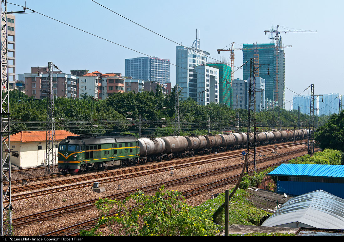 A unit tank train heads westbound along the very busy six-track line just east of the large Guangzhou East Railway Station. The two center tracks are dedicated for use by high speed trains of the Guangshen Railway between Guangzhou and Shenzhen. The two farthest tracks handle freight traffic as well as slower intercity passenger trains, including "through trains" to Hong Kong. The two closest tracks, although highly maintained, seem to be used primarily for light engine and equipment moves between the station and a coach yard just east of this location.