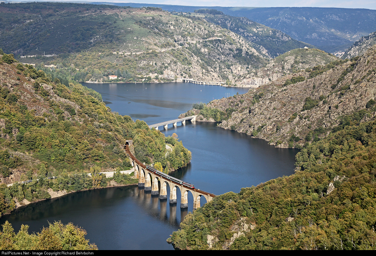 | Intercity Clermont-Ferrand – Nìmes is crossing the Altier Viaduct (length 257m, 843ft) above Lake Villefort. |