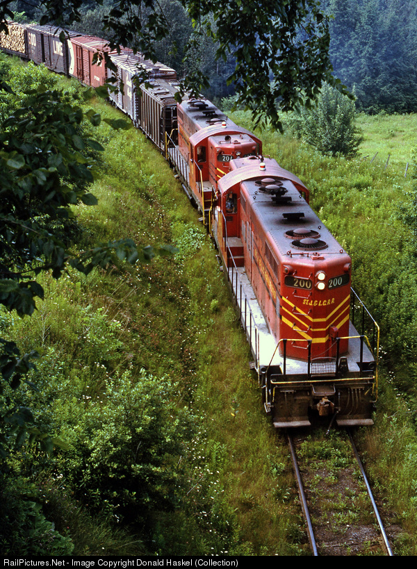 | St. Johnsbury & Lamoille County's "Saint J" turn is heading back to Morrisville, VT. Here we watch it climb out of St. Johnsbury going under Route 2 with ex NYC GP9 power. The GE 70 tonners are gone, covered bridges replaced, and track structure upgraded in order to accommodate the higher axel loadings from anticipated bridge traffic. Cars received from Canadian Pacific and Maine Central fill out this consist along with a smattering of on line loads. Photographer Ken noted it was a great morning in Vermont on this August day in 1972. |