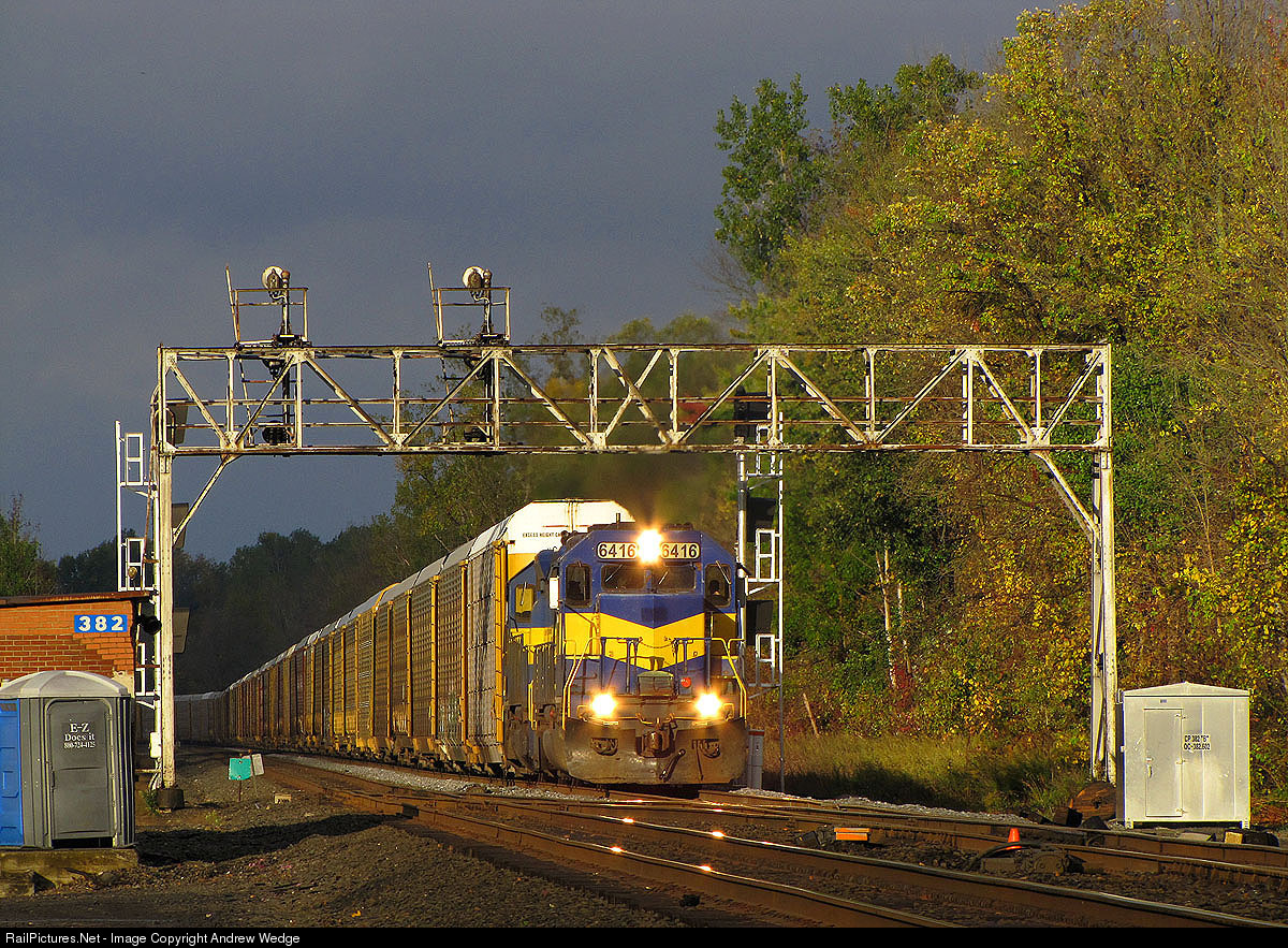 A small patch of sun breaks through on a very gloomy day as an eastbound autorack takes the signals under a classic New York Central signal bridge