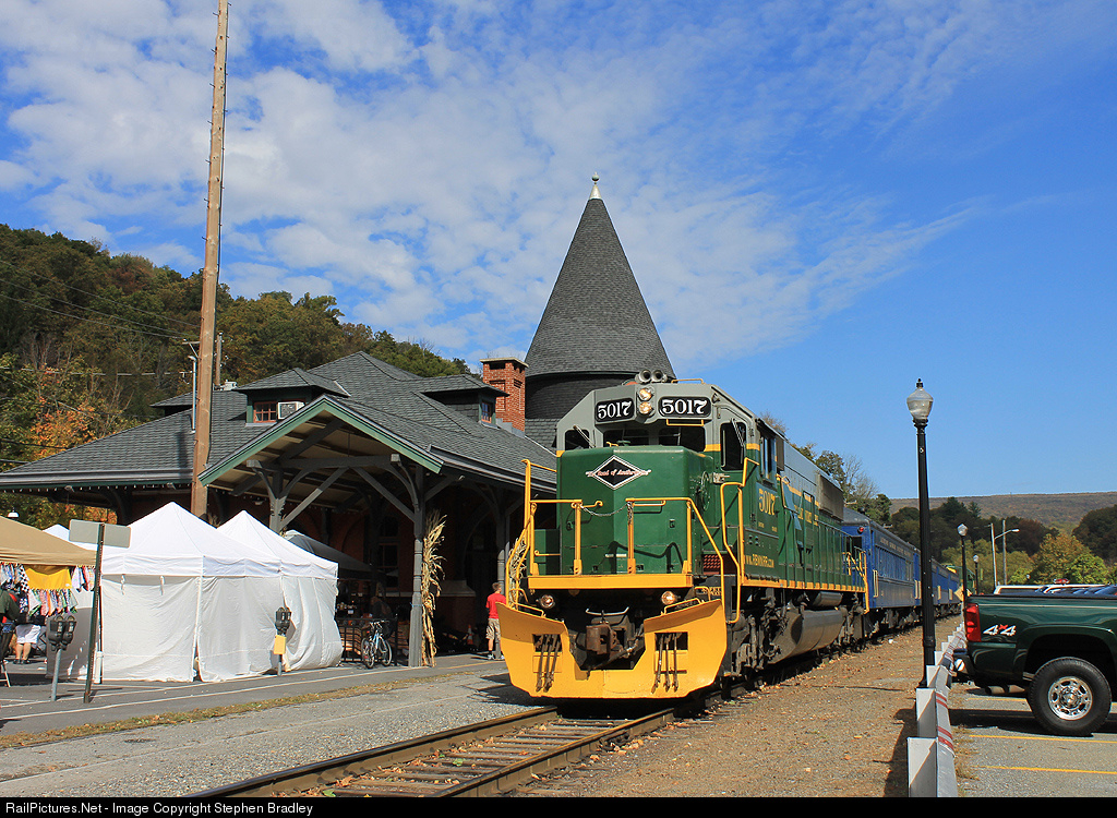 | Reading & Northern SD50 5017 brings a Hometown High Bridge train back into Jim Thorpe. The well preserved CNJ station is hosting a "Fall Festival" and the trains are very popular this time of year. |