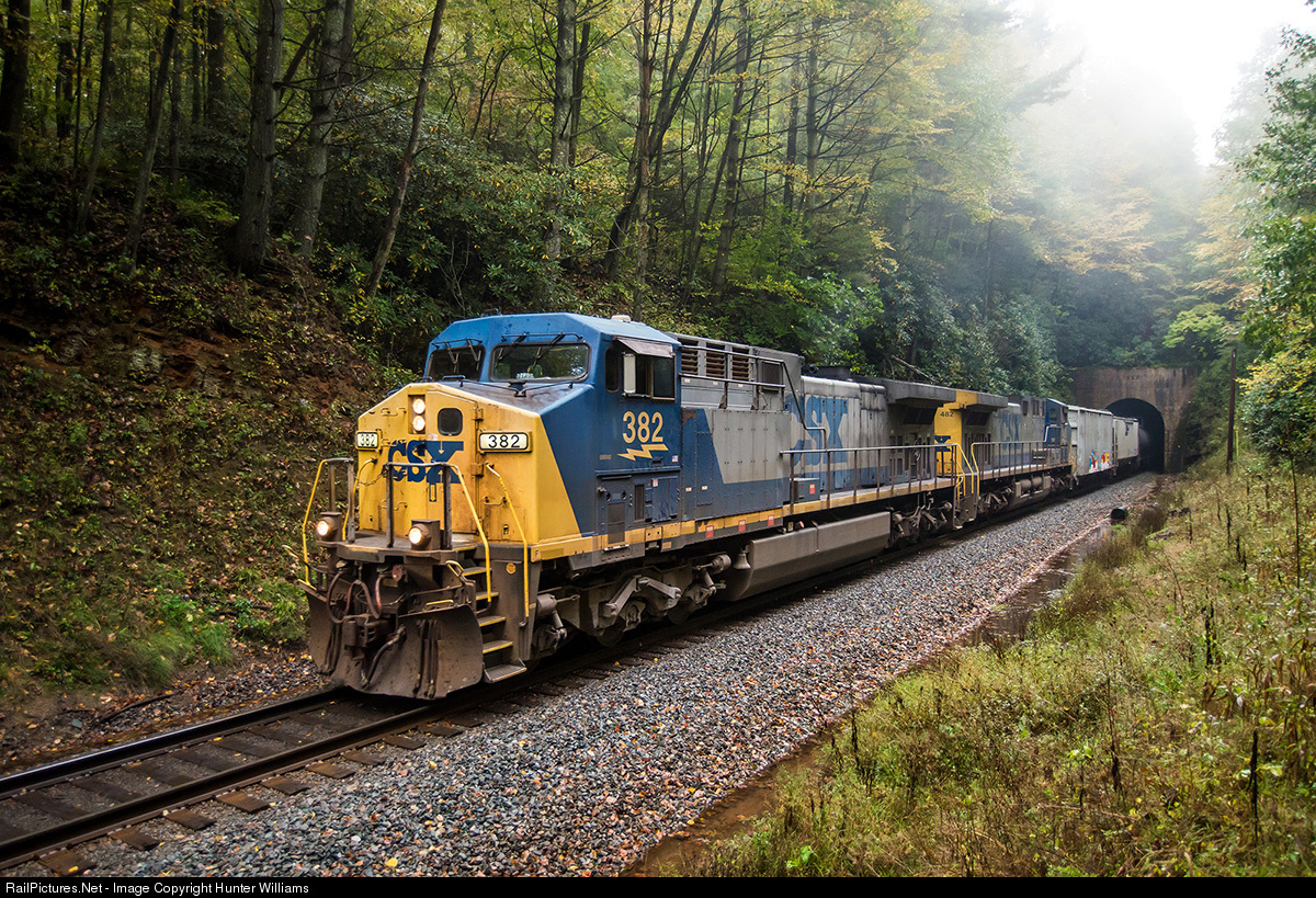 | A pair of AC4400CW locomotives lead a CSX train out of Ridge Tunnel as it heads north outside of Spruce Pine, NC on October 8, 2014. This is at the very top of the mountain on what used to be the Clinchfield Railroad mainline. |