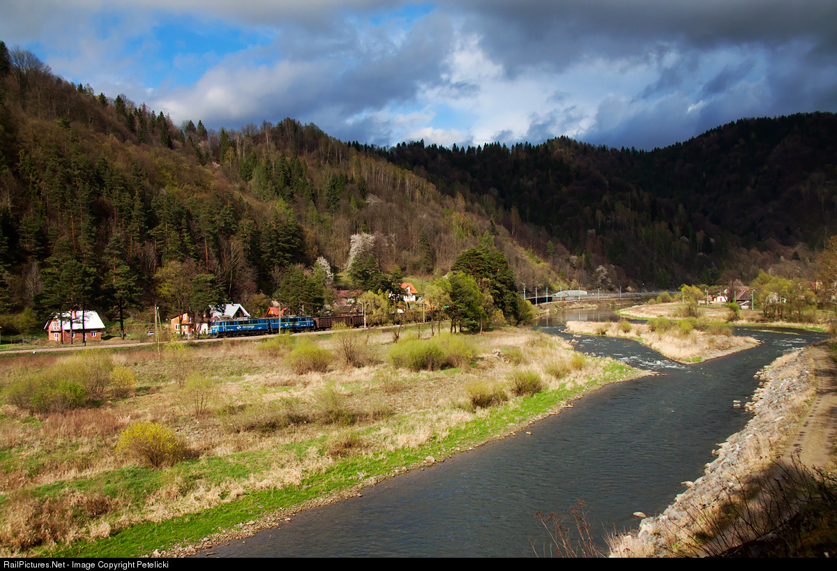 | Freight train from Muszyna to Tarnów Filia. In the foreground is the river Poprad, a natural border between the Poland and Slovakia. |