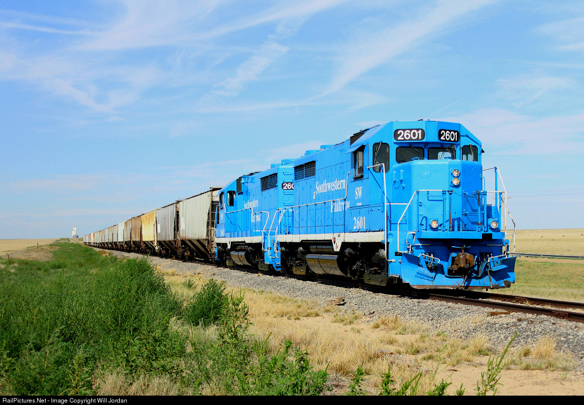 We spent the previous night in southeastern Colorado, and started heading back east on this hot summers day. On our eastbound trek, we stayed parallel to what we were thinking was an abandoned track since it had some shrubbery growing in it. However the moment we crossed the state line into Kansas, we could see the tail end of a short grain train. So we flew the 24 foot motor home down a dirt road so I could manage a couple shots of the train. It wound up to be a South Western Railway grainer heading east towards Dodge City, led by two GP26's, which ya won't find on many other railroads!