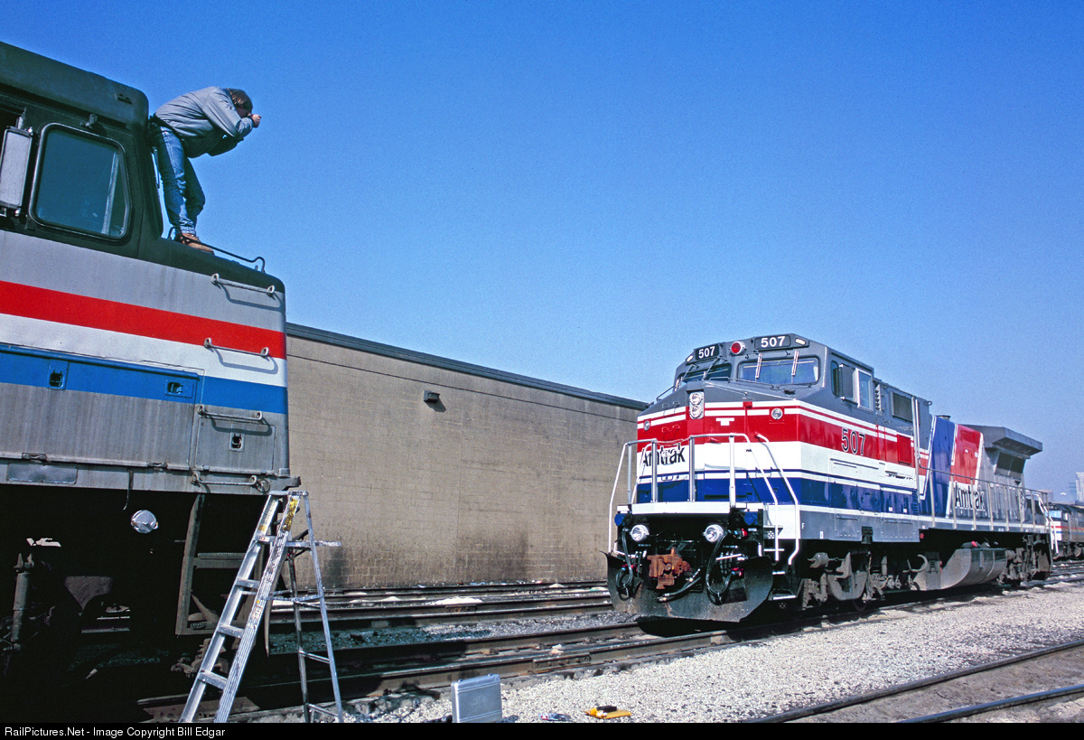 | This final shot of the series shows Mike's solution to finding the right location to shoot from. Amtrak personnel were kind enough to move an F40PH into position to give Mike the elevation needed to get the photo! Please see Mike's photo No. 403958 under Mike Danneman for the result on Rail Pictures.net. |