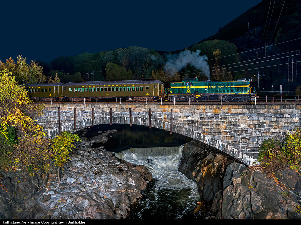 | The end of the 2014 Fall Foliage tourist trains on the Vermont Rail System was marked this evening by the return of the Alco RS-1-powered train's return to its winter location in North Walpole, New Hampshire. The train - deadheading from Chester, Vermont back to North Walpole, is seen crossing Bellows Falls from the Town of Bellows Falls over the former Boston & Maine Cheshire Branch stone arch bridge. GMRC Engineer Scott Whitney gave it some genuine Alco smoke for the final leg into the New Hampshire terminal. |