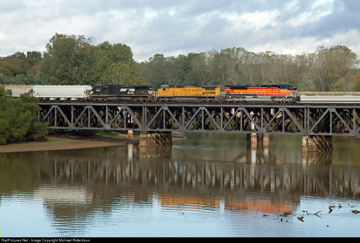 The UP Southern Pacific heritage unit leads NS train 172 crossing the Yadkin River just before entering the hump yard at Linwood NC
