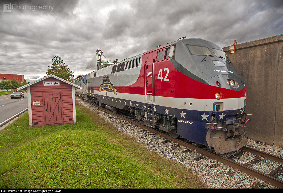 | Some rare mileage....the New River Train equipment takes a ride around the belt line so the consists can be turned and faced the correct direction for the trips in the Fall of 2014. The consist is being led here by Amtrak's Veterans Unit followed by two other phase V P42s. |