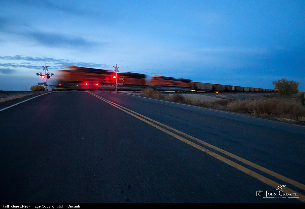 | Two BNSF SD70ACe's bring up the rear of this empty coal train at the County Road 51 grade crossing between Hudson and Keenesburg just after sunset.
