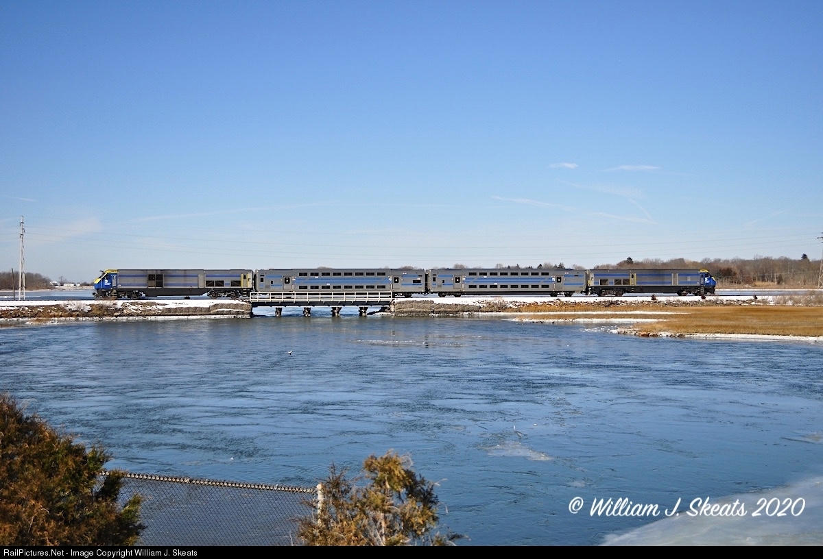 | DE30AC 422 has two bilevels and DE30AC 410 seen passing over the bridge over Hashamomuck Pond. The snow brings out two engines on the Greenport scoot allowing photo opportunities for their westbound runs instead of cab car in the lead. |