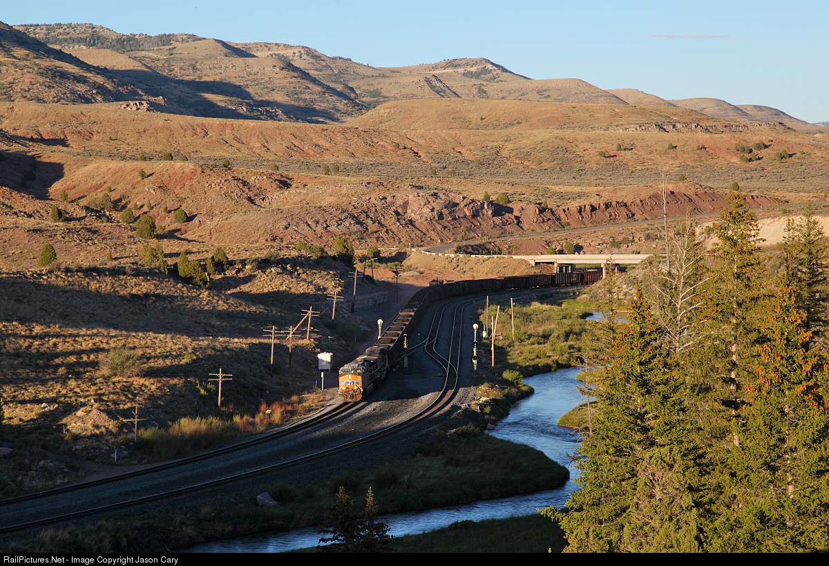 UP5790 negotiates the curves at Kyune on Union pacific's former DRGW mainline. A branch line once split from this location and climbed the mountain behind the train. A side trip up the road is rewarded with ghostly remnants of grade and bridge abutments.