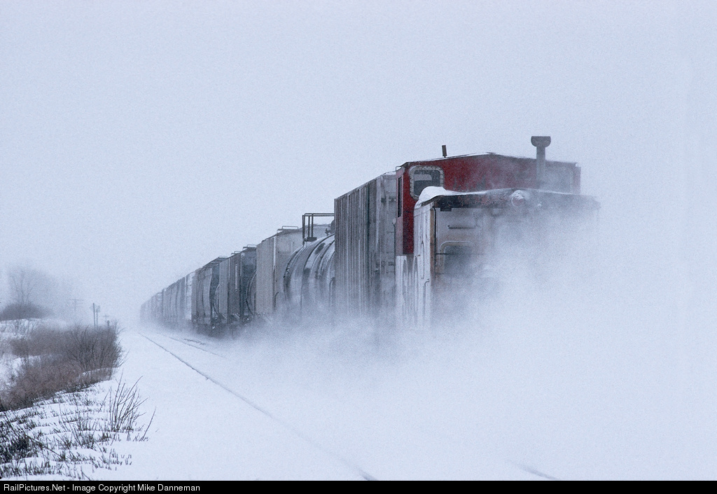 Trailing the traditional caboose, Soo Line train No. 218 kicks up powdery snow on a very cold February 25, 1994, at Duplainville, Wisconsin.