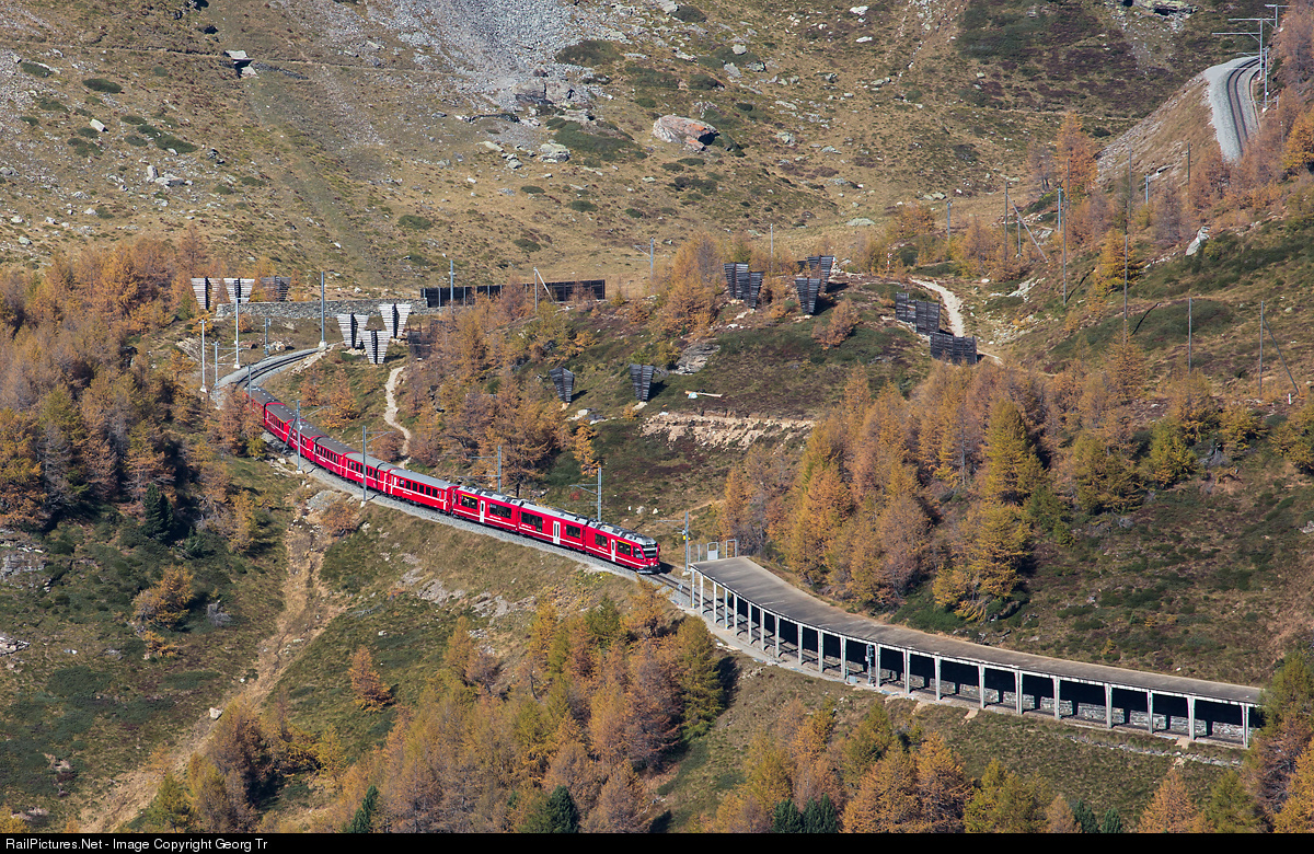 Unusual view onto the line of the Bernina railway of the RhB above Alp Grüm. Train 1637 from St.Moritz to Tirano, pulled by an ABe 8/12 "Allegra" trainset, coming down from Ospizio Bernina in the grade of 7.0 %, is entering the snow protection gallery in a few seconds on this beautiful autumn day.