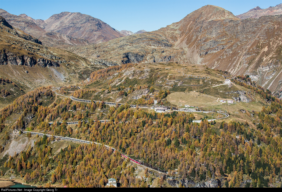 | View over Alp Grüm and the astonishing line layout of the Bernina railway of the RhB, most in grades of 7.0 %. Train 1637 with an "Allegra" ABe 8/12 trainset is rolling down towards Stablini crossing station. |