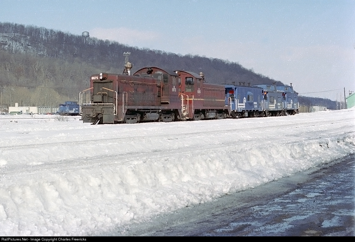 | A pair of former Lehigh Valley "Pups" brings three Conrail cabooses up towards R Tower on a cold February afternoon. These locomotives probably were assigned her during the Lehigh Valley years too. |