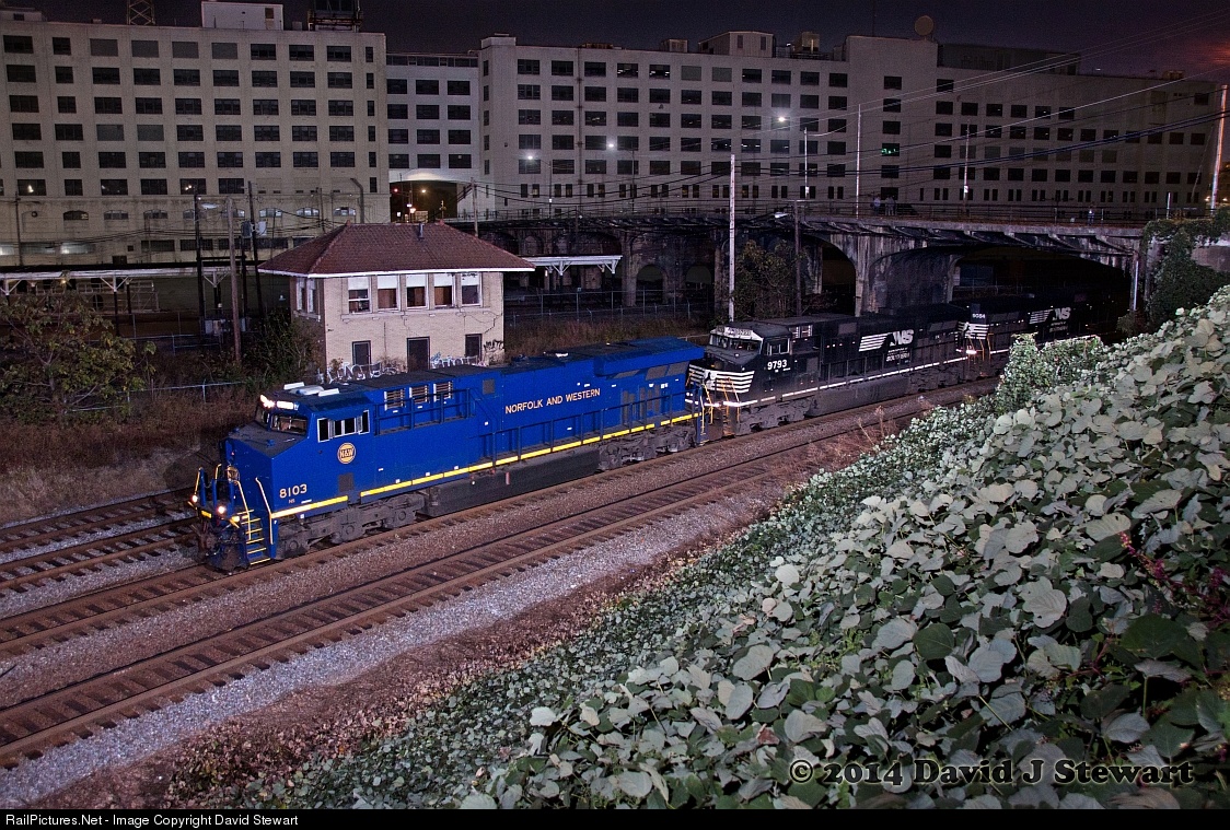 | NS manifest 335 passes through downtown Atlanta with it's Macon, Ga. to Sheffield, Al. train which is lead by Norfolk Southern's N&W Heritage unit NÂș8103. 335 is passing passing below the former Southern Railway off building on Spring St. and along the site of Atlanta's long gone Terminal Station. Seen behind the 8103 is the South Tower and one section of platform which are the only remaining artifacts from Terminal Station, Terminal was demolished in 1972. |
