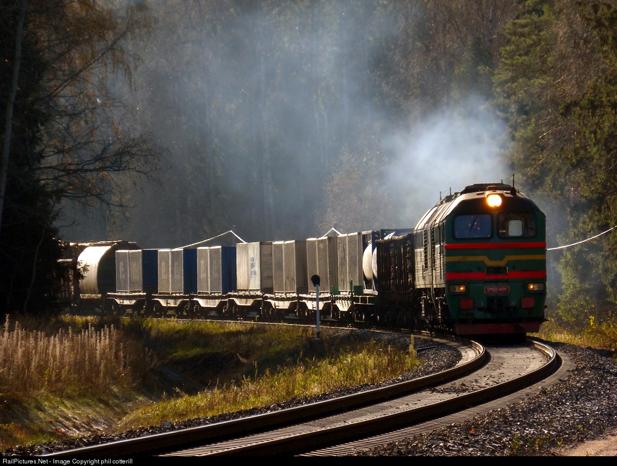 5 feet gauge double loco No 2M62-1171 is working hard with a Northbound train near Livani.