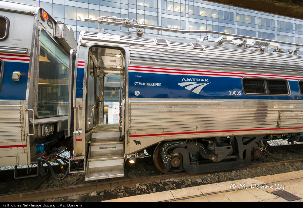 The 10005 is a former "Michigan Coach;" originally a Metroliner. It is outfitted with lasers and gizmos on the roof to gather catenary information at 125mph. Coupled to it is 10004, the Viewliner Theater Car.