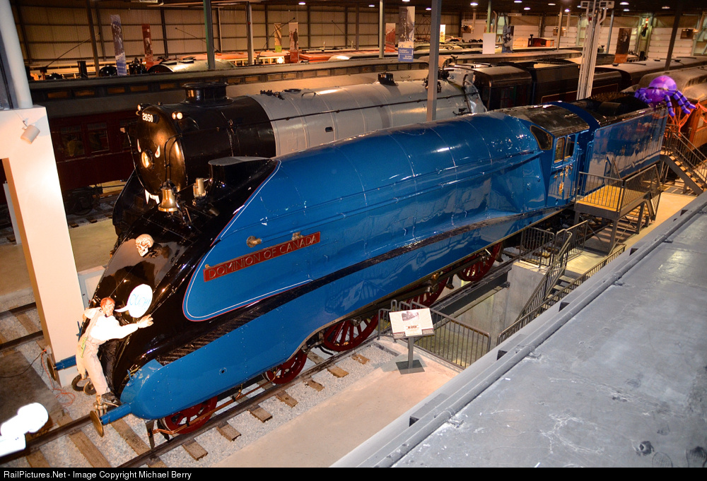 | Halloween at Exporail from up above. From the elevated vantage point of a balcony on the second floor of the main hall at Exporail we can see that a number of exhibits have been decorated for Halloween, including the two steam engines located in the middle of the hall, CP 2850 (the original Royal Hudson) and LNER 4489 (the Dominion of Canada). |