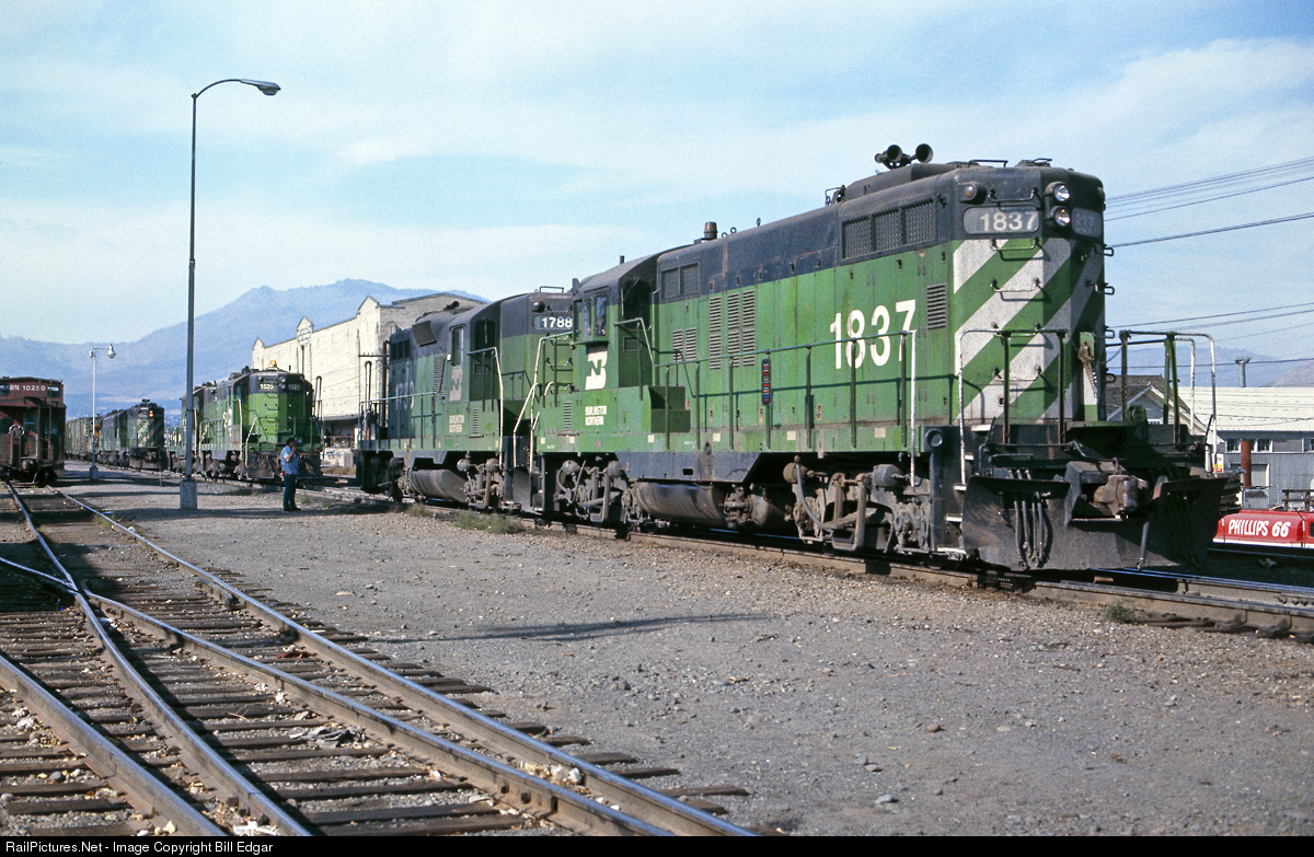 Rush hour in Wenatchee, BN style five years into the 1970 merger. Far left, a former GN caboose, still red, observes a westbound freight ready to depart on the mainline featuring the usual GP9/F7B/GP9 helper set on the rear. They ran on both the rear and cut into the trains. Closer to the camera two pairs of Geeps also occupy the mainline, apparently preparing to set up on various locals based out of Wenatchee. Likely candidates was the Oroville train, and maybe a Winton local. Another local would have been the Spud local to Quincy, the Mansfield local or the Alcoa switching job.
