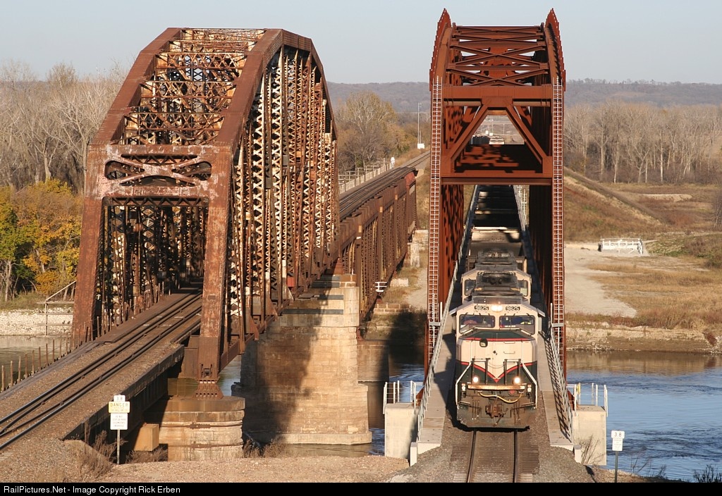 This westbound coalie is dressed up as a paleface for Halloween. The train is entering Nebraska on the new Missouri River bridge, constructed between February, 2012 and December, 2013. The original trestle on the left was constructed in 1879 and renovated in 1903, and remains in service - primarily for empty consists.