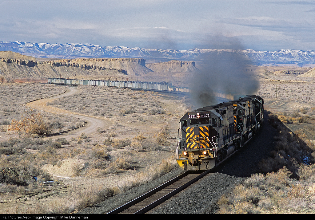 Somber gray clouds hang over the Wasatch Range on the morning of January 30, 2003, as Rio Grande SD40T-2 No. 5371 leads the Union Pacific “dirt train” past mile 607.4 east of Wash, Utah. Engineer Mel Baughman notches up the four black Tunnel Motors with a bit of smoke as the eastbound train storms by headed for the Sunnyside Branch.