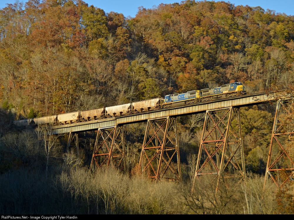 A southbound CSX grain trains fly's high on the Copper Creek Viaduct as the shadows begin to slowly creep up on the edge of the Viaduct