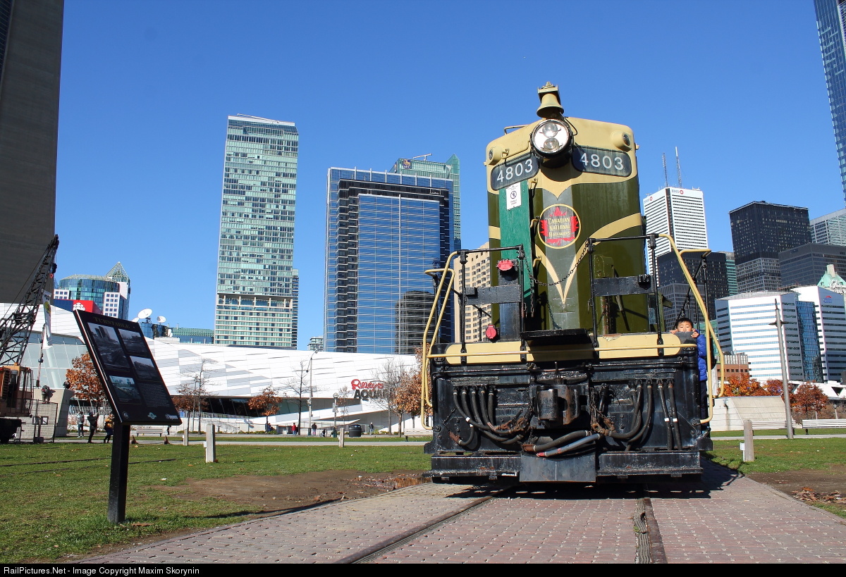 On a peaceful Sunday afternoon in downtown Toronto, CN 4803 sits retired at Roundhouse Park on display, something it has been doing for many years. In the background is the Toronto skyline, to the left a portion of the CN Tower can be seen, standing 457M in the air, and a display sign noting several things about #4803.