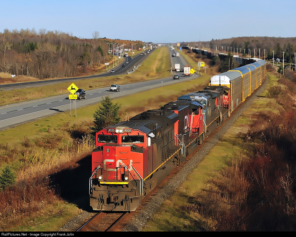 With the last rays of the November sun fading quickly, Joffre-Montreal train #401 has just left yard as it rolls alongside the Trans Canada Highway west of Quebec City
