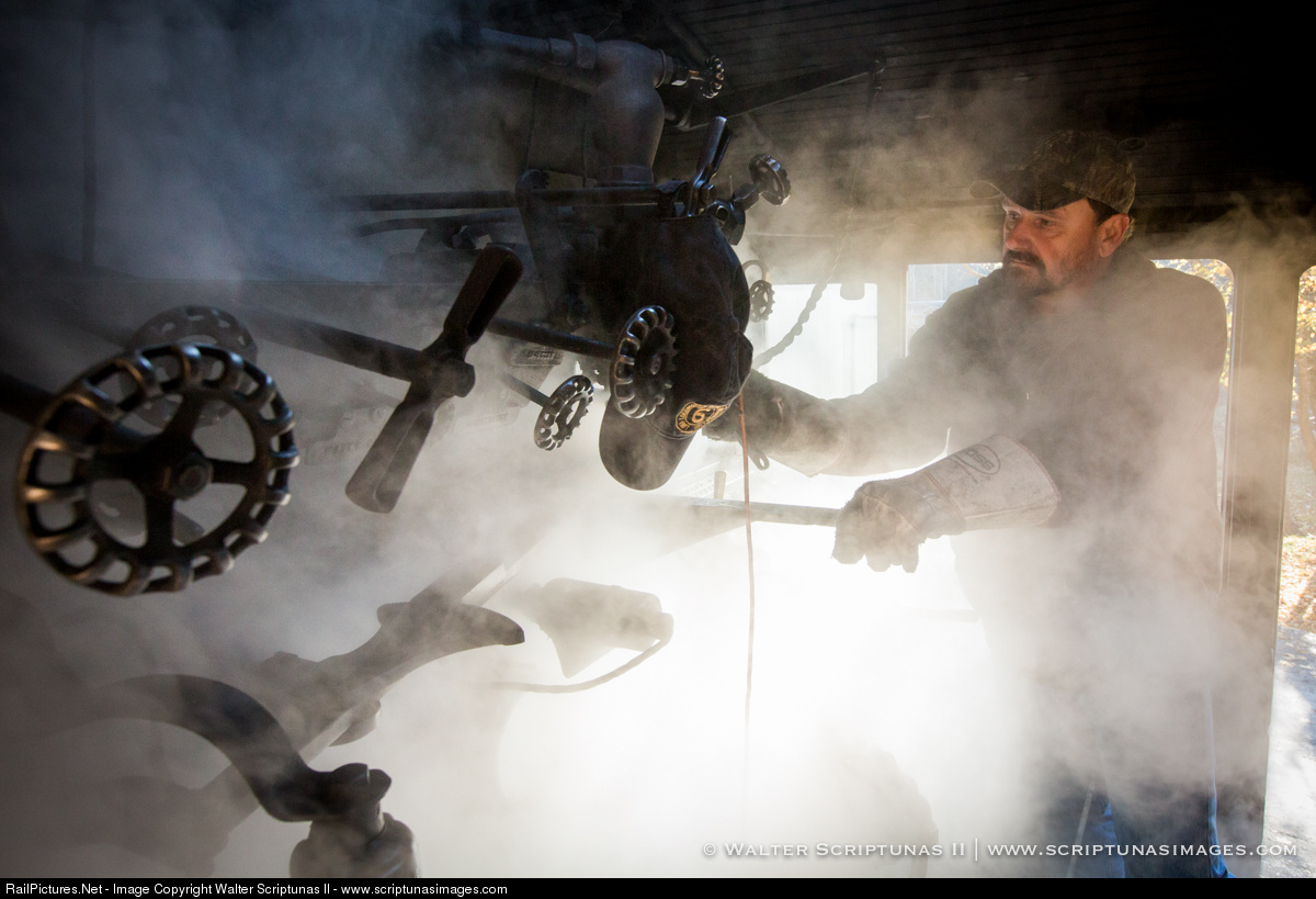 Engineer Danny Seldomridge blows down the glass on the hydrostatic lubricator before the days trip up the mountain to Bald Knob.