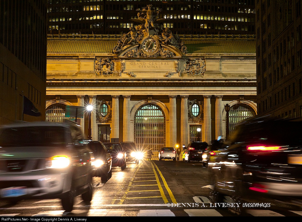 New York's jewel box of transportation, Grand Central Terminal takes a haughty look at the little gnats, also known as cars, swarming around it one evening.