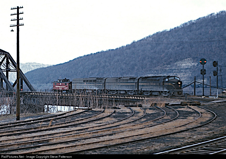 Three PRR Baldwin Sharks have come across the Monongahela River to pick up interchange from the P&LE and the Monongahela Ry. at BF Tower, Brownsville, Pa. April 14, 1961. Five yard tracks precariously end at the river bank.