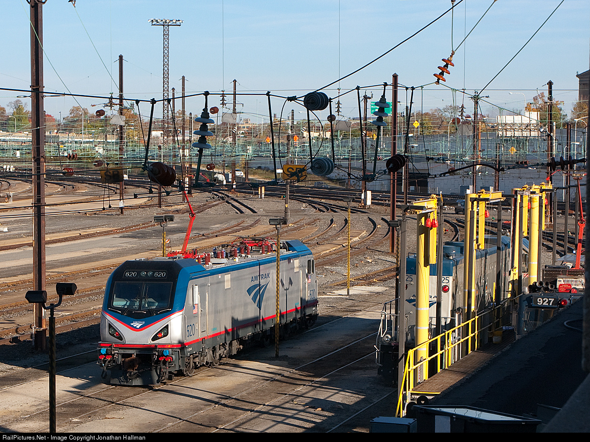 One of AMTRAK's newest engines, ACS-64 #620, awaits the call to duty in the yard just outside of 30th Street Station. Partially visible to the right in the photo are older AMTRAK power in the form of a Geep and one of the AEM-7s that the 620 and her sisters are replacing.