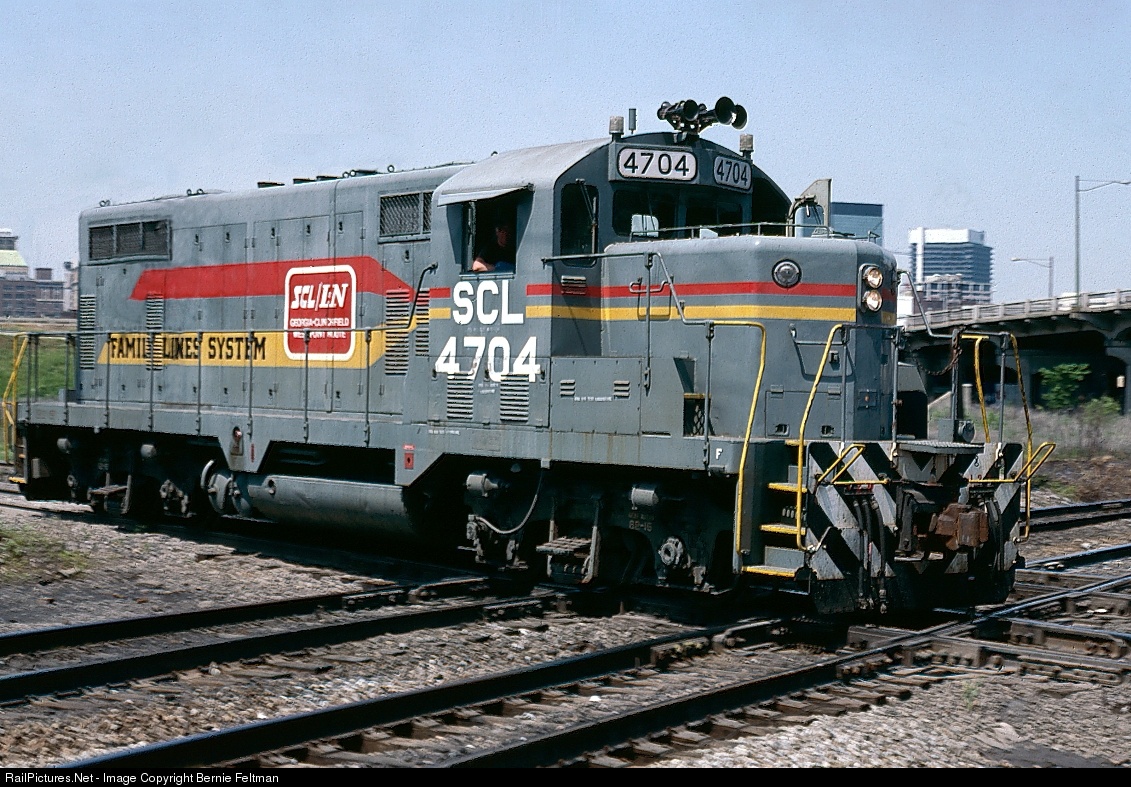 Seaboard Coast Line GP16 #4704, crossing the Southern Railway Birmingham-Sheffield NA line at 27th Street, returning to the former Louisville & Nashville Boyles Yard. #4704 was originally a GP7 built as Atlantic Coast Line #238, then re# SCL 769 where it remained until going into the Uceta GP16 rebuild program in Tampa. Later, in the CSX renumbering, it became CSX #1750