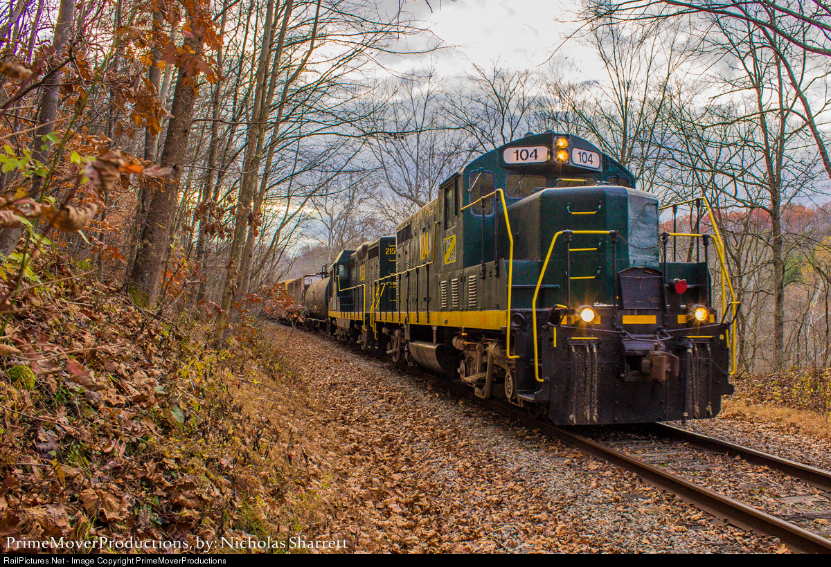 Off of a dead end road in one of the most remote areas of Ohio, Ohio South Central Railroad GP7 #104 and GP7u #2153 work east with a short consist. The train is on a final approach into Byer Tunnel #2. The Ohio South Central was formed in February of this year and is shown here operating over the former B&O St. Louis line, in what is left of the fall foliage.