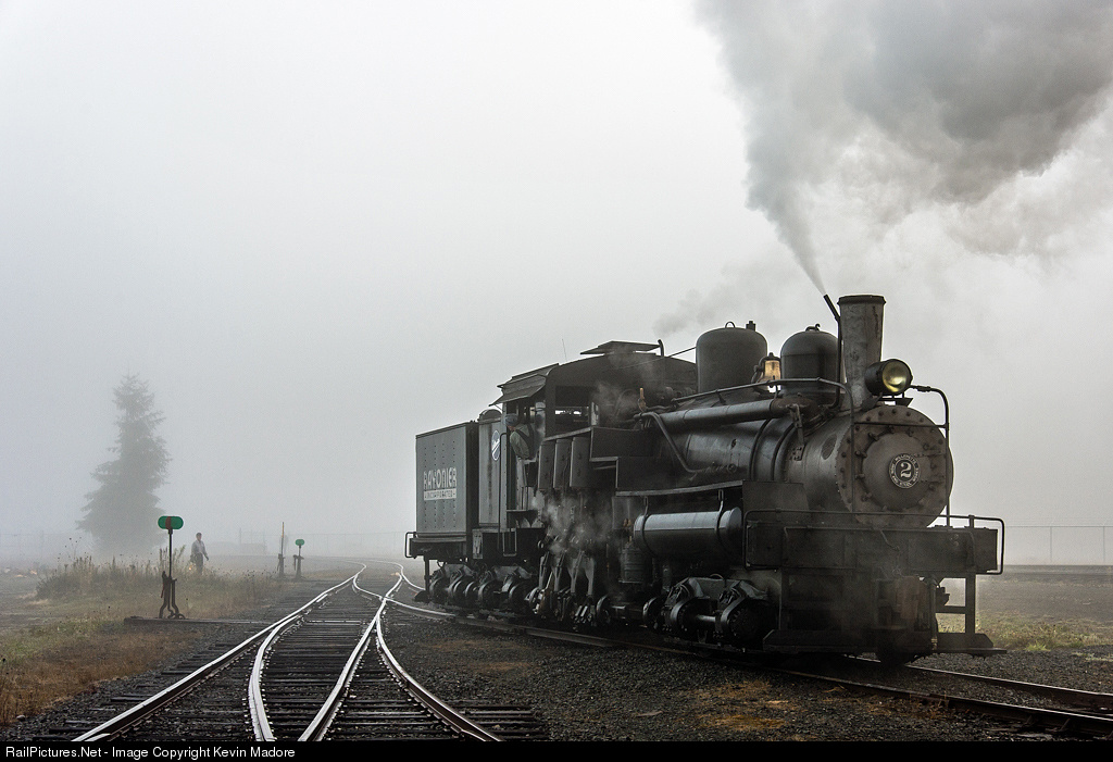 Although she looks for all the world like a typical Shay Locomotive, Rayonier #2 is, in fact, a Willamette. In 1921, several of the patents associated with Ephraim Shay's legendary geared locomotives expired. That left the door open for other manufacturers to step in and compete for new locomotive business. One such manufacturer was the Willamette Iron and Steel Works of Portland, Oregon. That company recognized a demand for a locally-produced locomotive, to serve the needs of lumbering operations in the Pacific Northwest. The Willamette folks made some improvements to Shay's design, notably adding superheaters. The resulting engine was more efficient than the Shay or Heisler, and it didn't need to travel all the way across the US to be delivered. Although Willamette only built 33 of these machines, the competition they provided lit a fire under both the Lima and Heisler Companies, both of which were more or less forced to come out with improved designs to keep pace. The result was the Lima Pacific Coast Shay and the Heisler West Coast Special. Unfortunately, only 6 of the Willamettes survive today. The only operable example is the one you see here, which now pulls tourist trains on the Mt. Rainier Scenic Railroad.