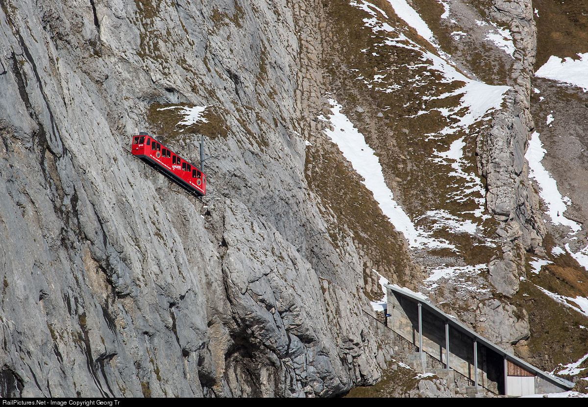 Electric railcar Bhe 1/2 # 26 of the world's steepest cogwheel railway to Pilatus, crossing the rock face of the "Esel" (donkey) mountain on a grade of up to 48.0 %.