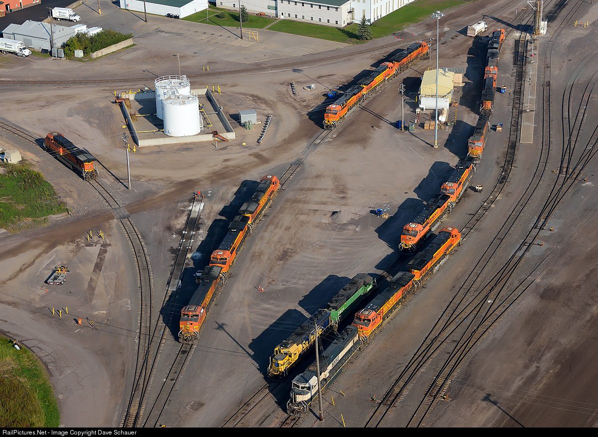 | A former ATSF GP40X and green 2921 stand out in a sea of modern high horsepower EMD and GE locomotives at BNSF's ex-Great Northern engine facility in Superior, Wisconsin. On the left are remnants of the whisker tracks for the large roundhouse that once stood here. Taken from a helicopter. |