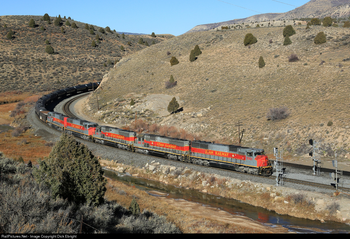 The crude oil business seems to have become nearly as important to the Utah Ry. as the coal business. According to a URY engineer I talked to, they are shipping out around 80 cars of crude oil a week to be interchanged to the Union Pacific at Provo, UT. A crew from Martin yard makes a short turn of about 5 miles or so to the oil loading facility at Wildcat 2 or 3 times a week where they exchange empties for loads and return to Martin yard. Then, a couple of times a week a road train makes a turn from Provo, over Soldier Summit to Martin with a bunch of empty tanks and a few loads of acid from the Kennecott smelter at Magna, Utah. They exchange the acid loads for empties and swap oil empties for loads and then return to Provo. This photo shows the eastbound road train of oil empties as it is descending Price River Canyon at the west switch of Kyune siding. The 5 big 6 axle units all wear the Utah Ry’s attractive gray and red paint scheme: no G&W orange on this train today!