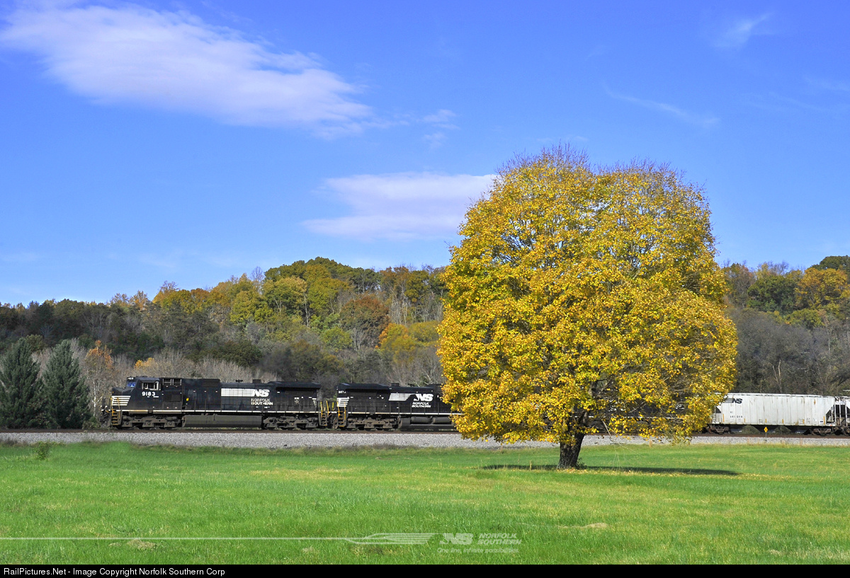 Virginia Division train 189 passes a lone tree in a field of green as it climbs the grade up Christiansburg Mountain in Elliston, Va., away from Roanoke. 189 is a daily manifest freight operating between Crewe, Va., and Portsmouth, Ohio. Photo by Casey Thomason. For more information about Norfolk Southern, visit www.nscorp.com