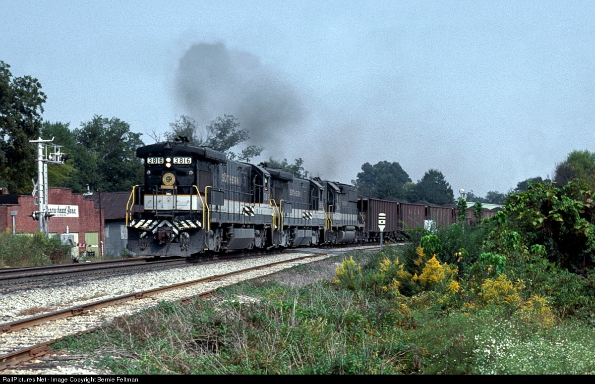 B36-7 #3816 leads fellow B36-7 #3815 and GP50 #7060 southbound at Dalton. Serving as mid-train power are B36-7s 3817, 3818, and 3819 (six 4 axle, high adhesion units, including 5 of the 6 B36-7s owned by Southern Railway). Just ahead is the crossing with the L & N. Trailing the power is a loaded coal train for Georgia Power Company's Plant Wansley, located at Carrollton, GA. The B36-7's were built 6 months earlier in March 1981 and on Thanksgiving weekend 1981 would all be in temporary storage at Southern Railway's Atlanta Peagram Shop complex.