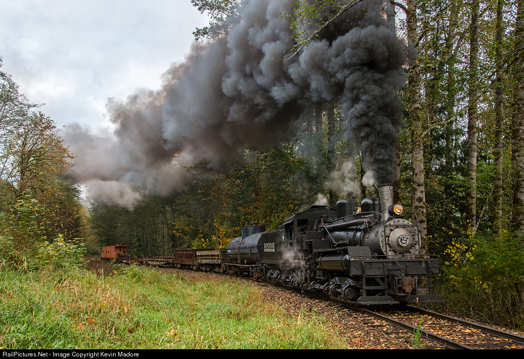 Wet rails and a heavy train might leave a conventional rod locomotive slipping the tires on the mountain grades, but for a geared engine like this Willamette, it's a piece of cake. Much like a Shay, the Willamette has three vertical cylinders, all of which are on the right side of the chassis. These cylinders turn a massive drive shaft, which is geared to every last wheel set on the engine's three separate trucks. It's the locomotive equivalent of All Wheel Drive. The gearing ratio ensures that while the drive shaft is spinning at a speed that will allow the engine to make a lot of power, the wheels are turning at a much slower speed, similar to a car in low gear. With all of that heavy machinery on the right side of the engine, the designers of both the Shay and the Willamette shifted the boiler to the left side of the chassis in order to maintain lateral balance. The resulting combination of evenly distributed power and low gear allows this type of engine to climb grades much steeper than any rod engine could ever handle. And yes, like most western steam engines, virtually all of the Willamettes were oil burners. Back in the day, they burned heavy bunker oil. Today, most preserved oil burners, like Rayonier #2, burn waste oil.