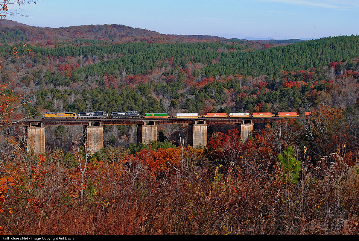 | With the sound of dynamics echoing through the mountains, NS 203 creeps across Wells Viaduct while running on approaches behind NS 221. Although I was late capturing the peak of fall colors in the area, the lead unit as well as the containers add plenty of color to this beautiful scene! |