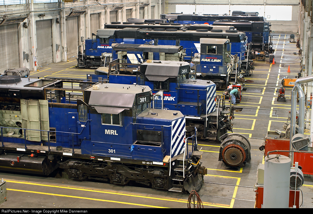 An assortment of Montana Rail Link locomotives are in various states of repair, being stripped for parts, or being stored in the railroad’s Livingston Shops on May 7, 2012. Up front is former Clinchfield/Seaboard/CSXT, now MRL EMD SD45-2 No. 301, which unfortunately was scrapped in 2014.